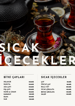 BİTKİ ÇAYLARI SICAK İÇECEKLER IHLAMUR 80.00₺ ÇAY 30.00₺ PAPATYA 80.00₺ FİNCAY ÇAY 45.00₺ ADA ÇAYI 80.00₺ BALLI SÜT 80.00₺ KIŞ ÇAYI 90.00₺ HOT CHOCOLATE 90.00₺ YEŞİL ÇAY 80.00₺ KARADUT 75.00₺ NANE & LİMON 80.00₺ ELMA 75.00₺ NAR 75.00₺